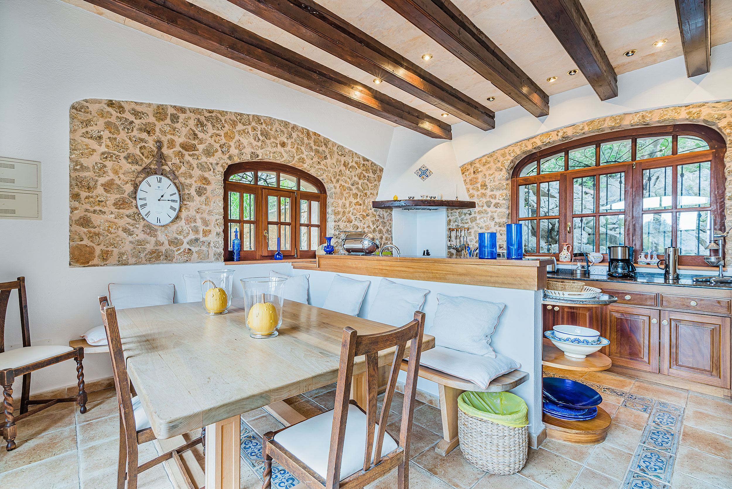 On from the dining area steps lead up to the large country style kitchen which is very well equipped, offering an informal dining area and access to the outside terraces.