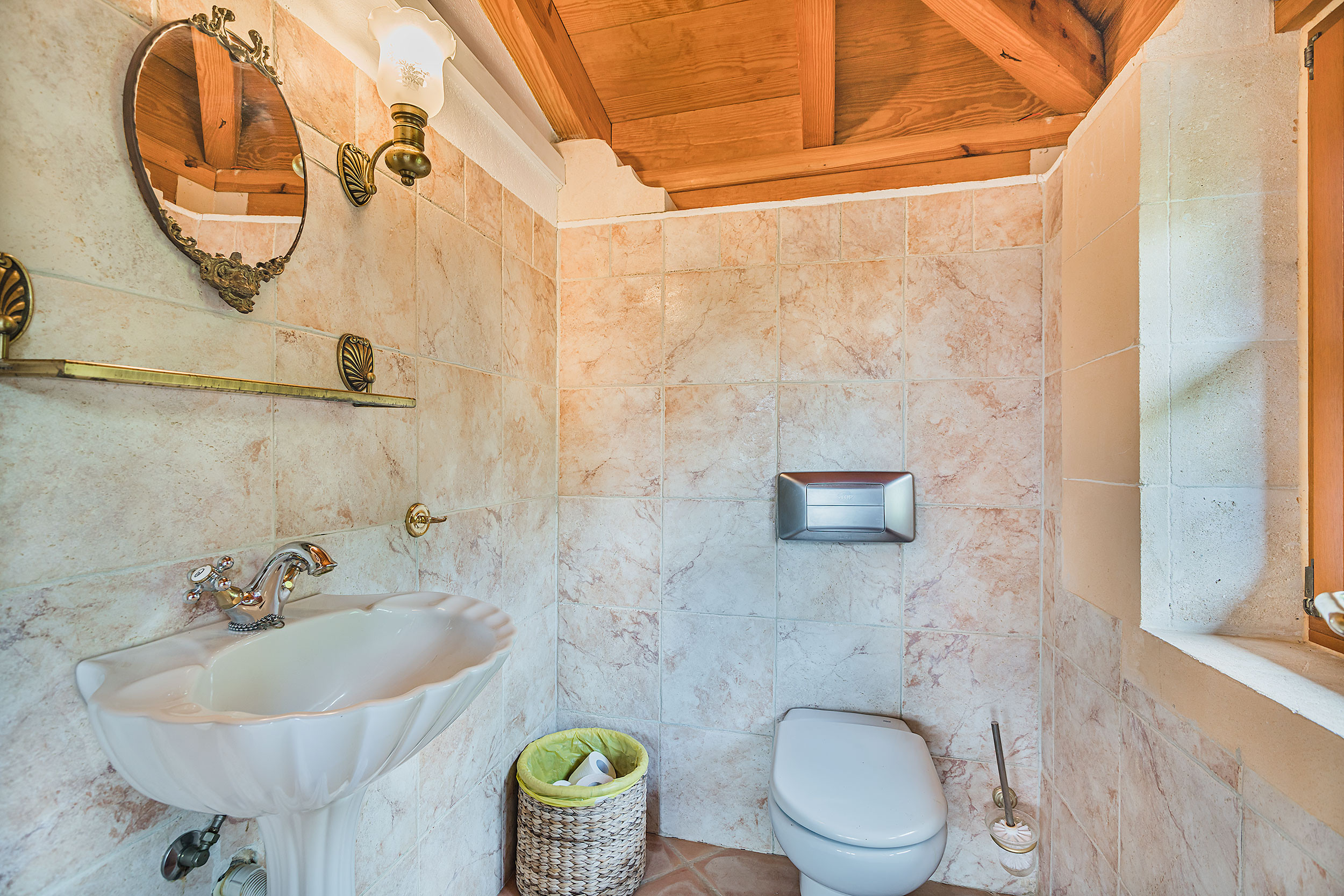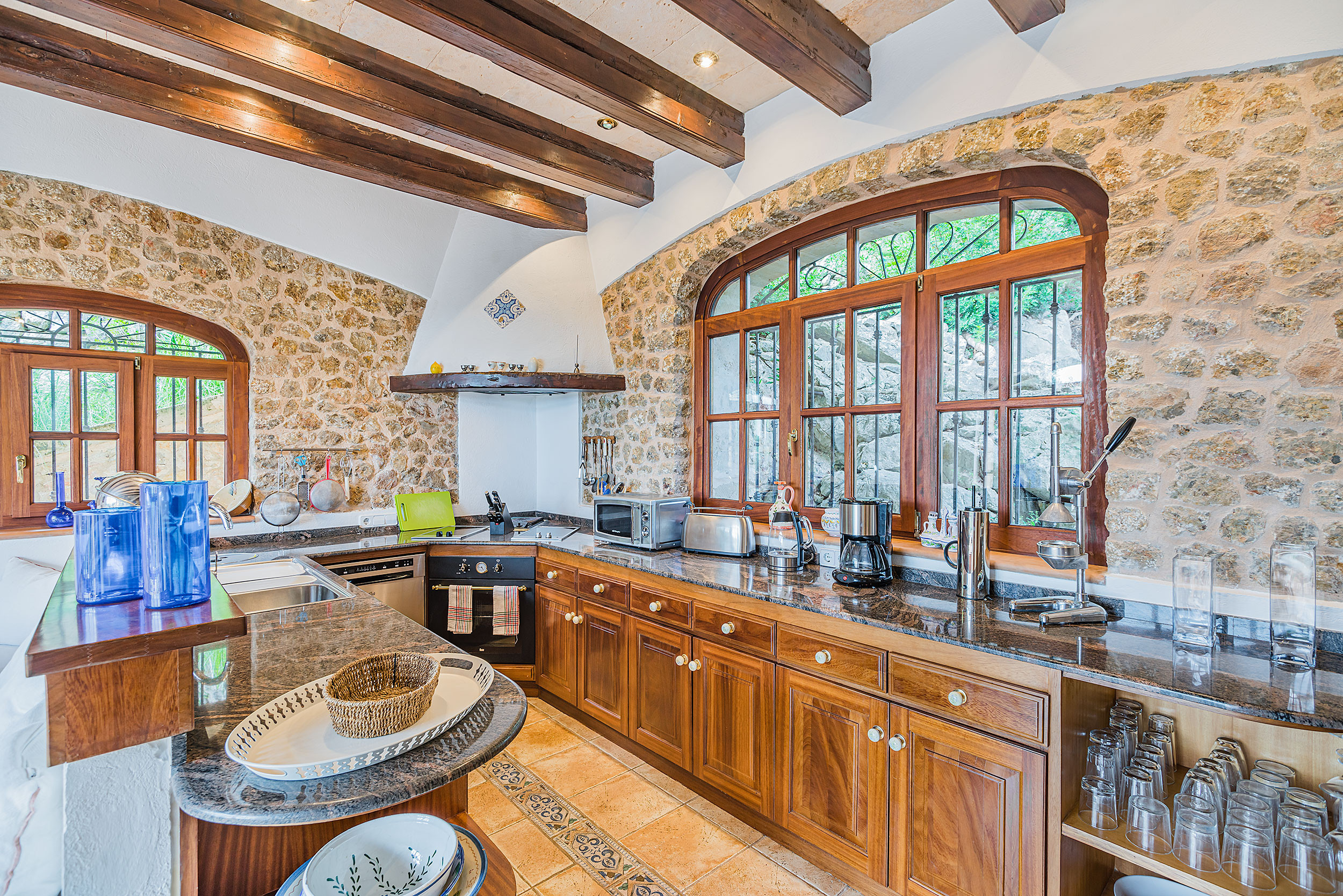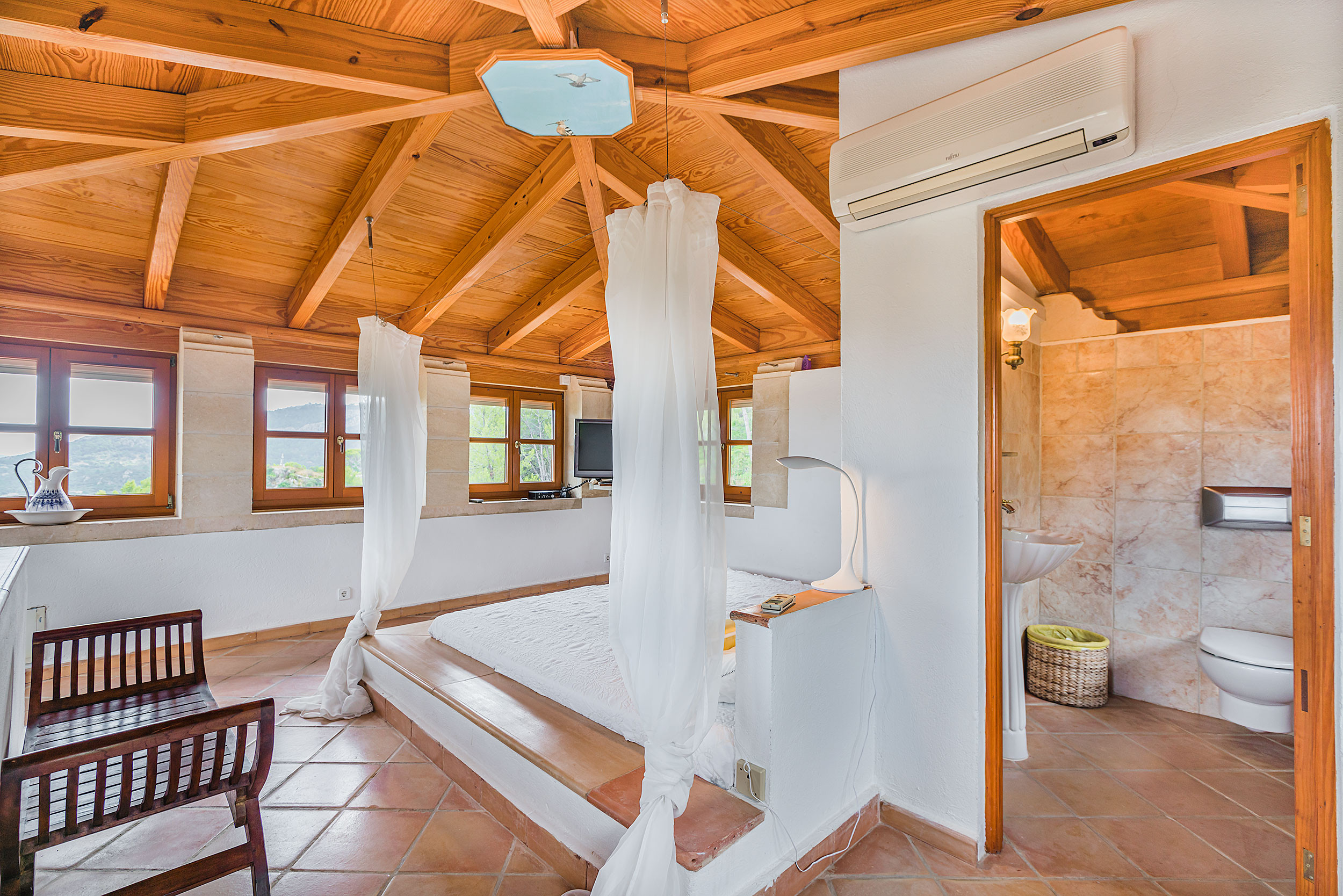 The light and spacious main house has 2 bedrooms (one double, one with a bigger bed - 140cm and one single bed - 90cm), a large family bathroom, modern kitchen and spacious living area. There are unspoilt views of the Tramuntana mountains from the main house. The high ceilings, modern paintings and interior of the house give a Mediterranean feel to it. The sitting area leads on to the dining area with large table ideal for family meals, as well as a study area with views over the expansive gardens. The house has air conditioning, central heating, TV,DVD, Hifi, WiFi and a fireplace.