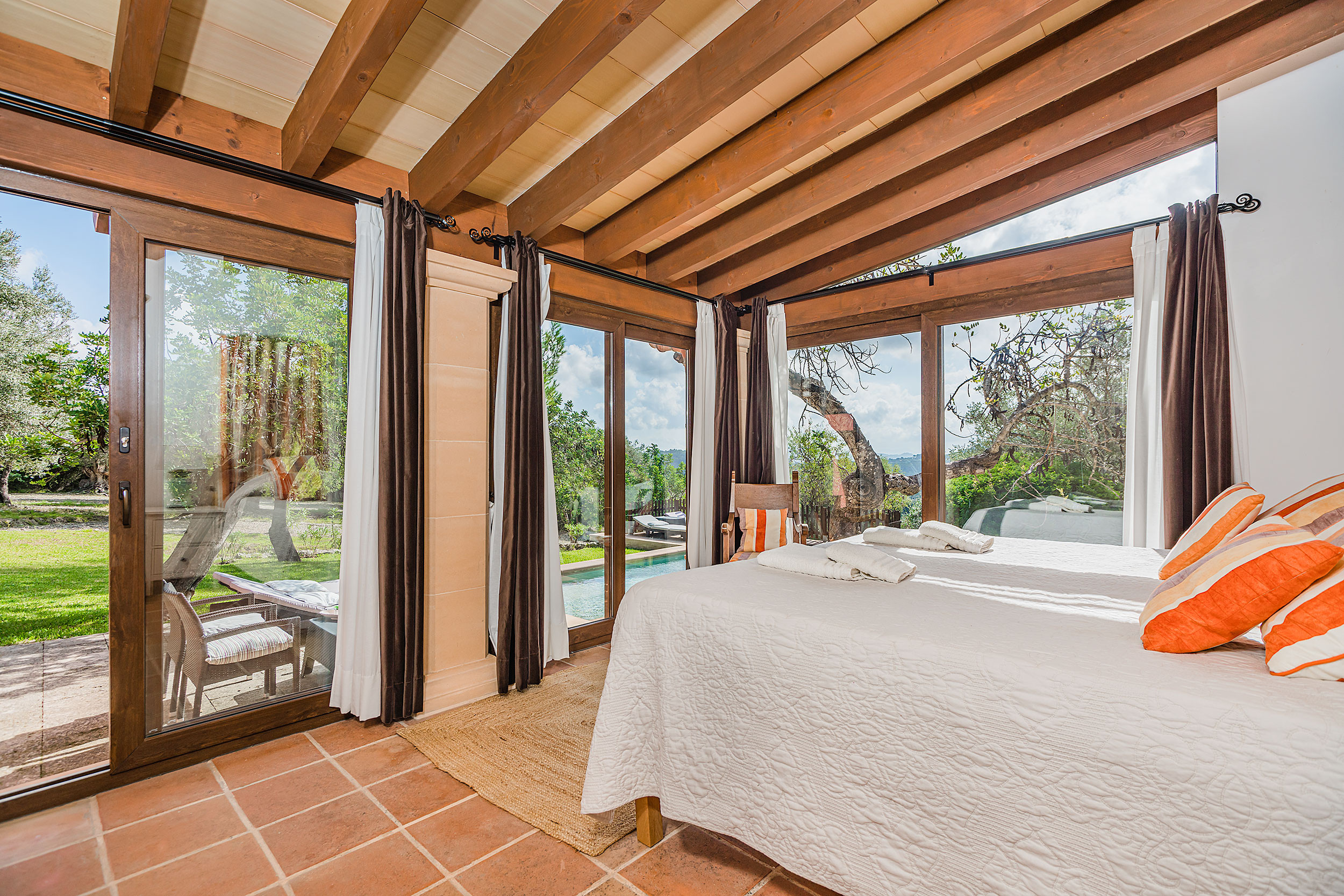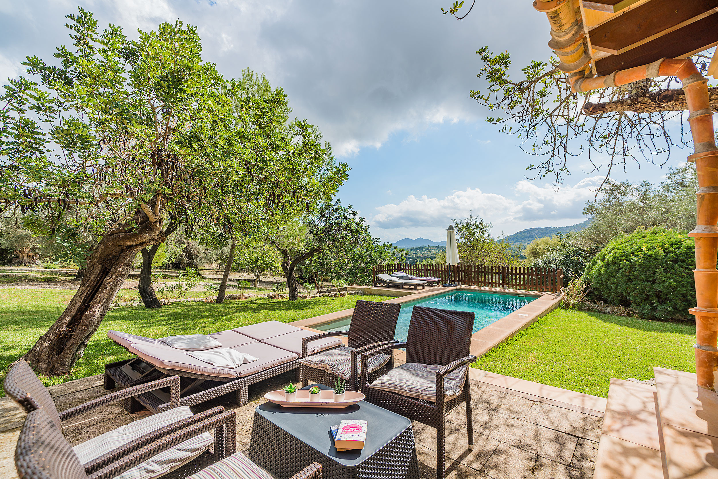 Villa Almondoi is a typical Mallorcan country house near Pollensa, with stunning views over the surrounding landscape to the mountain peaks that protrude between the trees.
