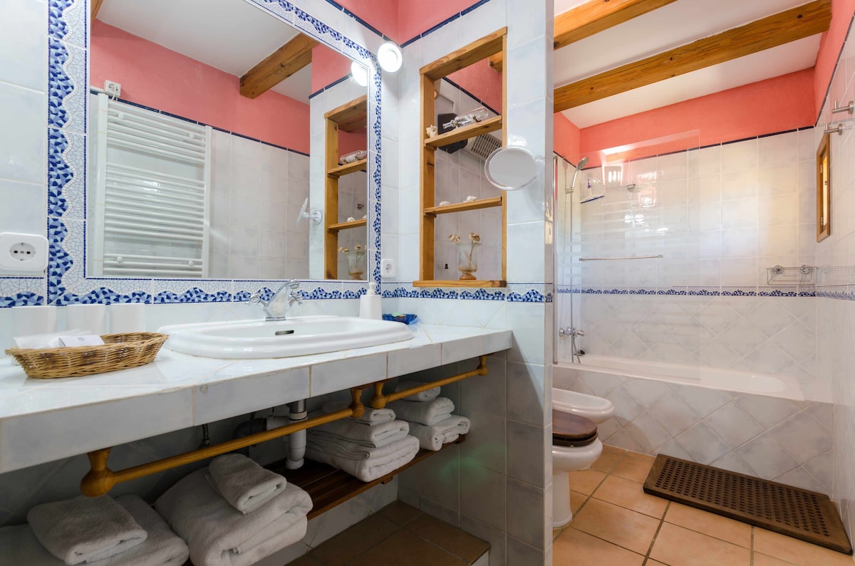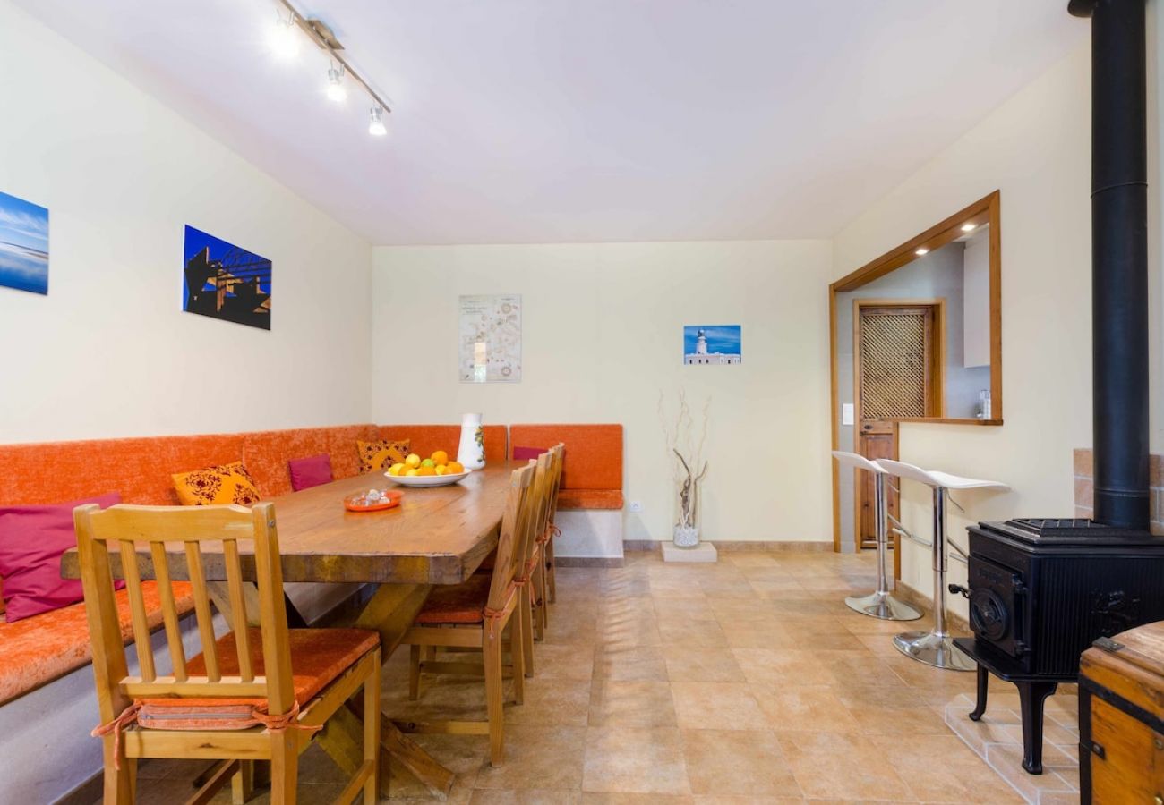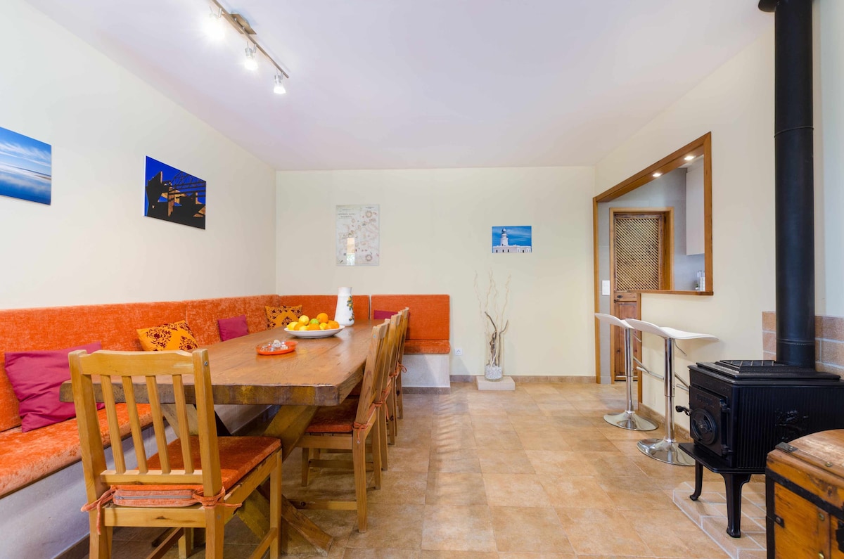 Although the house is so close to the sights and the beach, it is situated in a very romantic location in the countryside. The terrace and the porch invite you to barbecue or sunbathe on one of the 2 sunbeds, while the children play in the garden. The upstairs terrace can be accessed via an outside staircase and is equipped with garden furniture and a parasol. On entering, there is a dining room leading to the kitchen, equipped with coffee machine, dishwasher and gas hob, among other things. On the other side is the living room with wood burning cooker, air conditioning and television. Ideal for a family, there is one bedroom with a double bed and one bedroom with a single bed, as well as a bathroom with bathtub and hairdryer. Depending on the season, you can pick fruit directly from the tree. On the finca there are several animals, such as dogs.