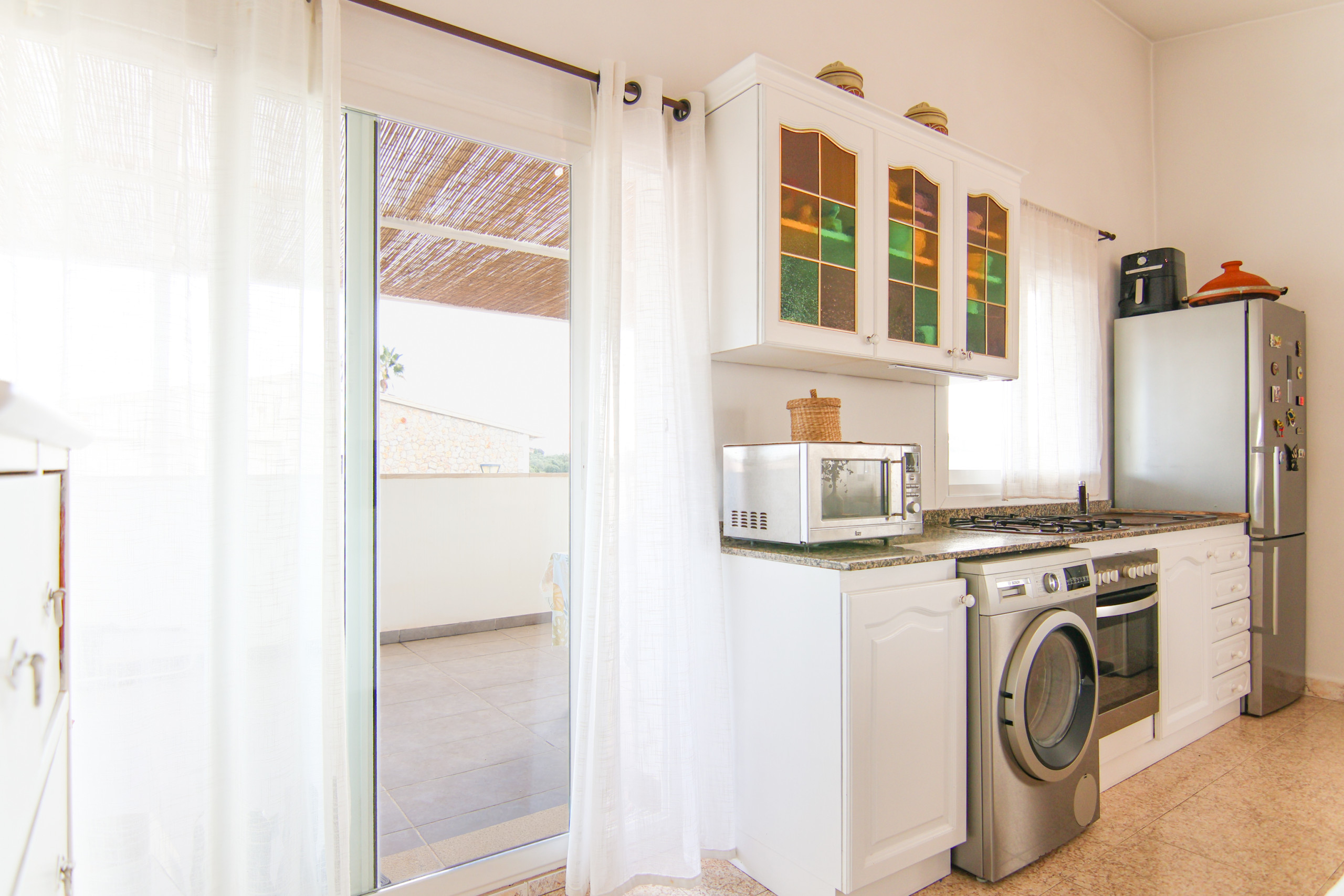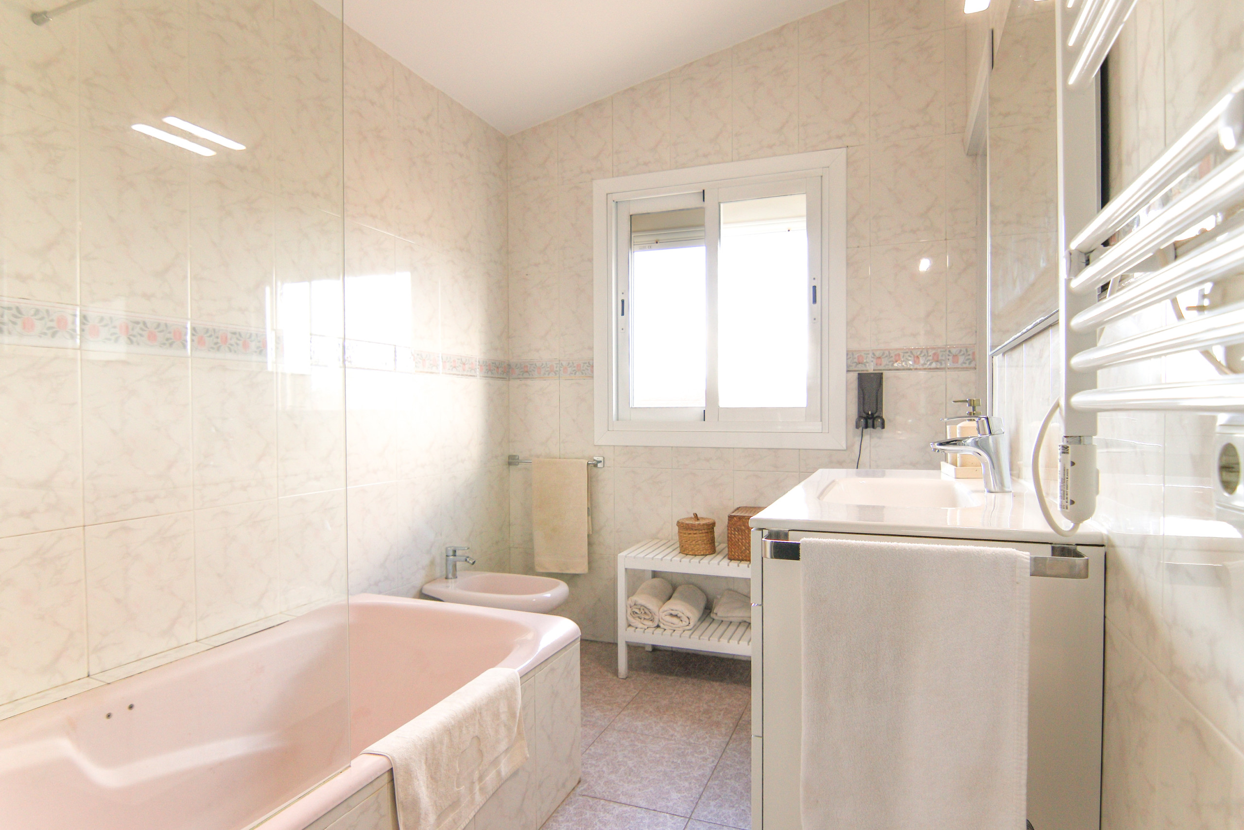 It has 3 bedrooms, 2 bathrooms, a bright living-dining room and a fully equipped kitchen with everything you need for your holidays: fridge, freezer, washing machine, dishwasher, oven, microwave, coffee maker, toaster, kettle, juicer and complete kitchenware.