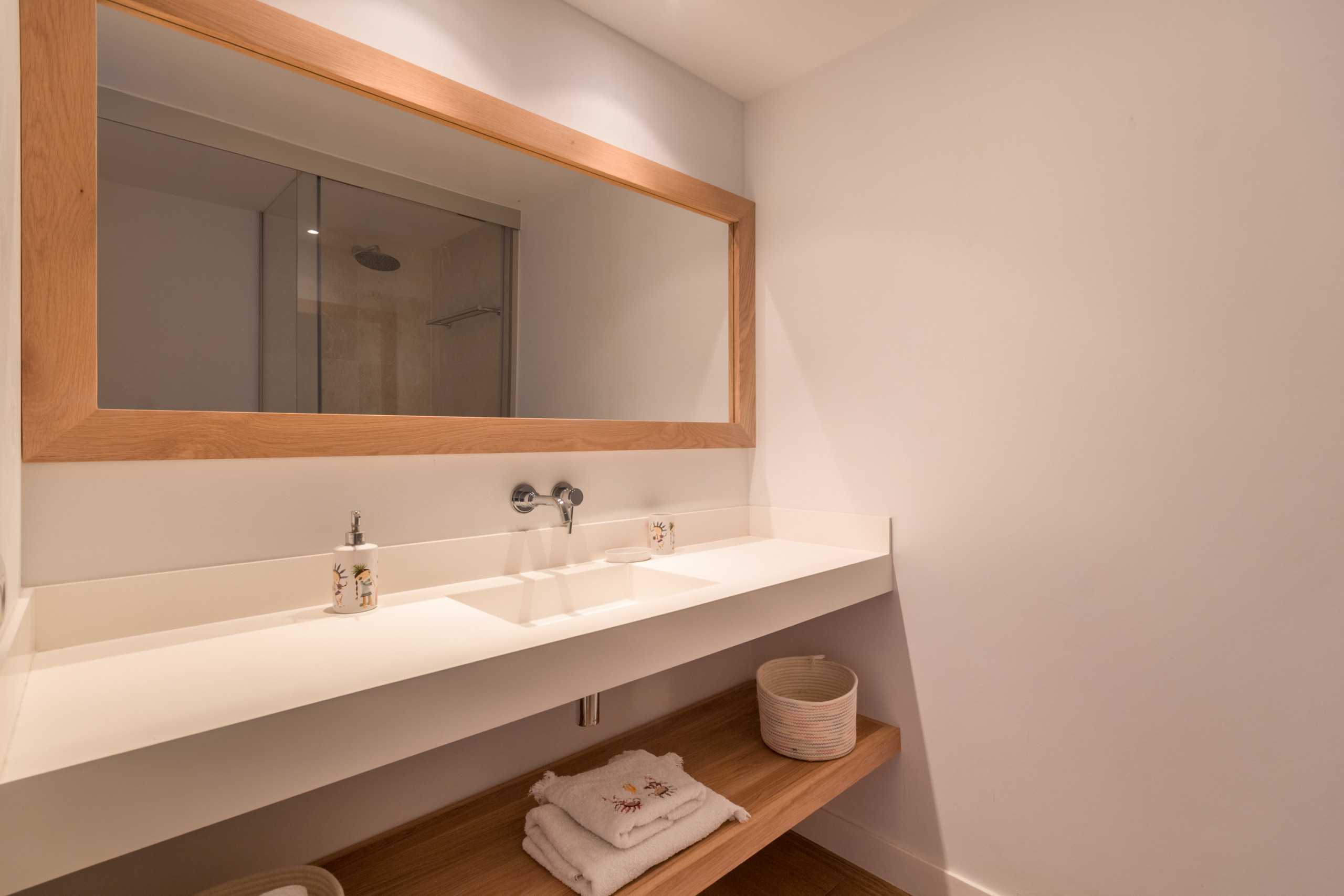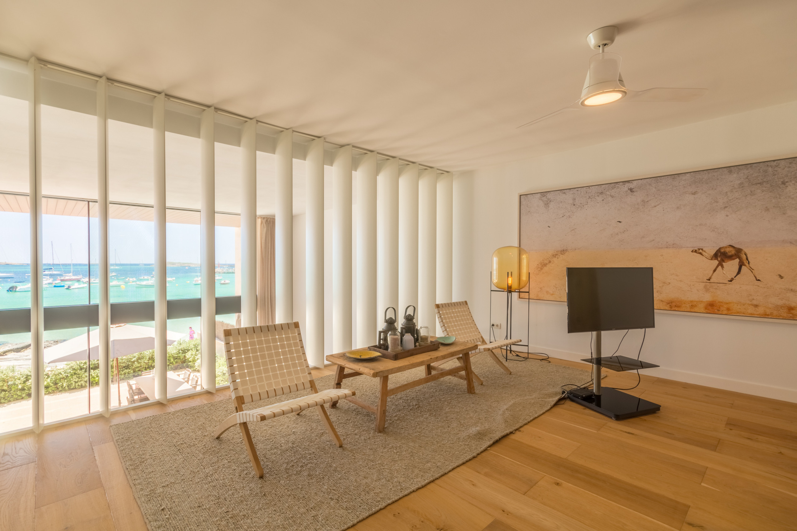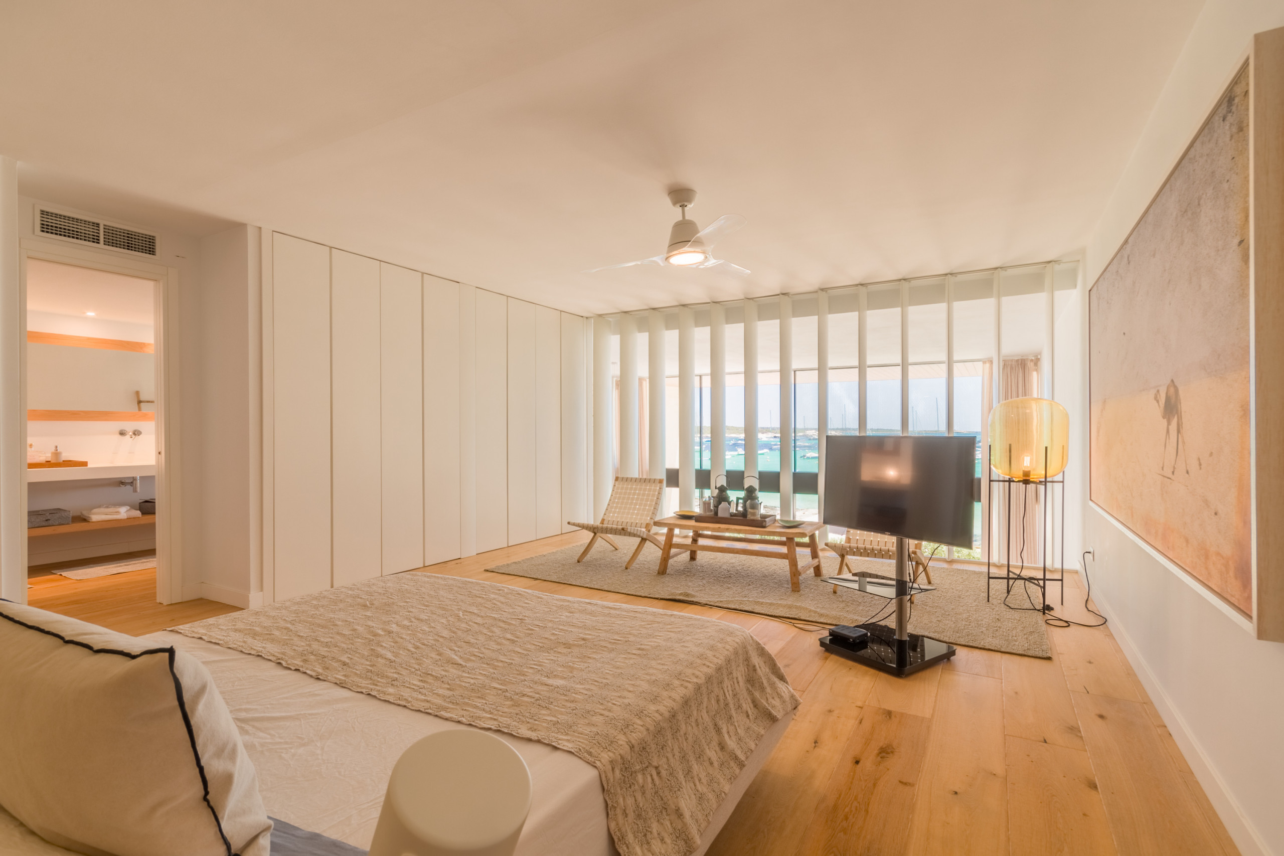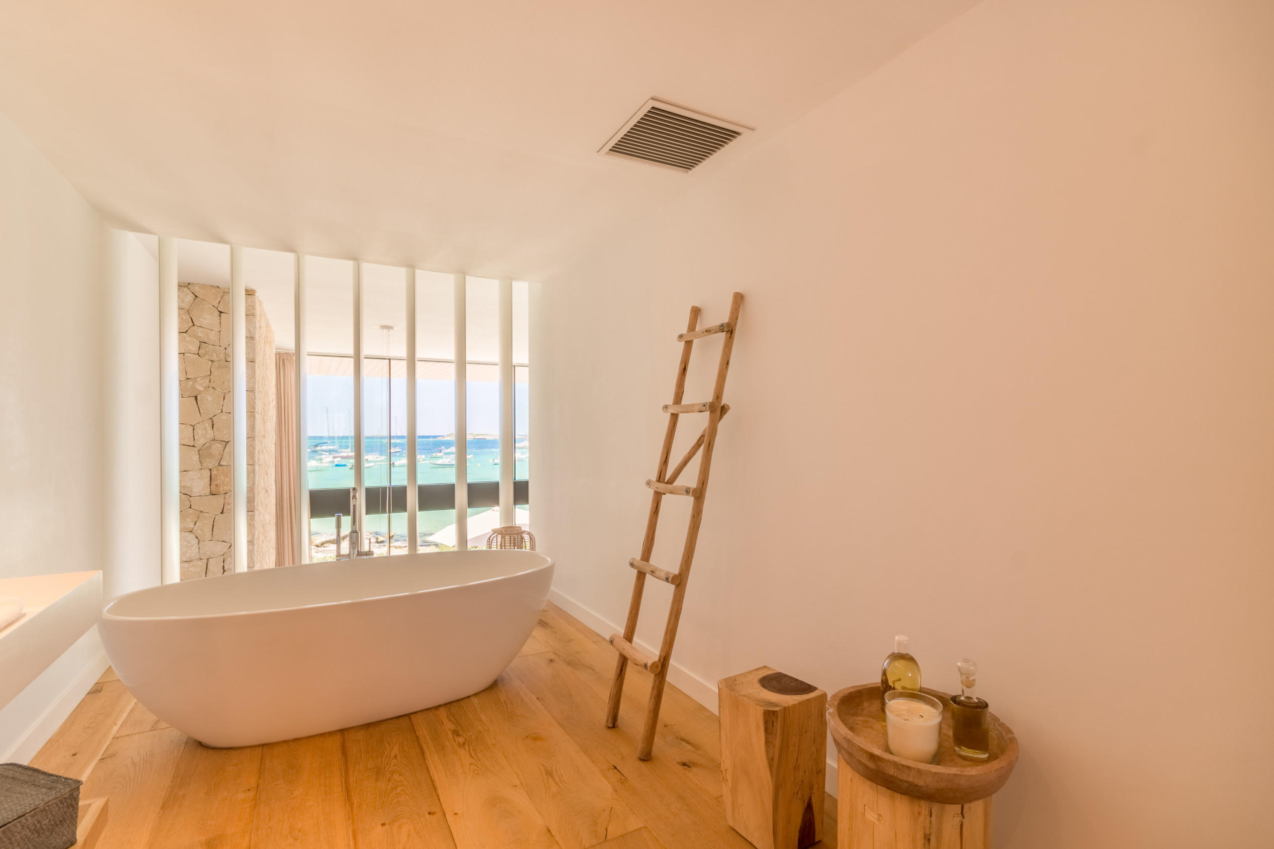 Accommodating up to 8 guests including 1 baby, the villa features 4 spacious double bedrooms, each with its own en-suite bathroom for complete privacy. Spread over 2 floors, the interiors are defined by neutral tones, natural materials, and abundant light, creating a warm and sophisticated atmosphere. The open-plan living area connects to a fully equipped modern kitchen and extends onto a bright furnished terrace with sea views. The master bedroom stands out with a freestanding bathtub overlooking the Mediterranean, while the rest of the rooms offer comfort and individuality. Amenities include air conditioning, underfloor heating, fireplace, international TV, WiFi, safe, and laundry facilities. Outdoors, guests enjoy a private fenced terrace, a balcony, and direct beach access.