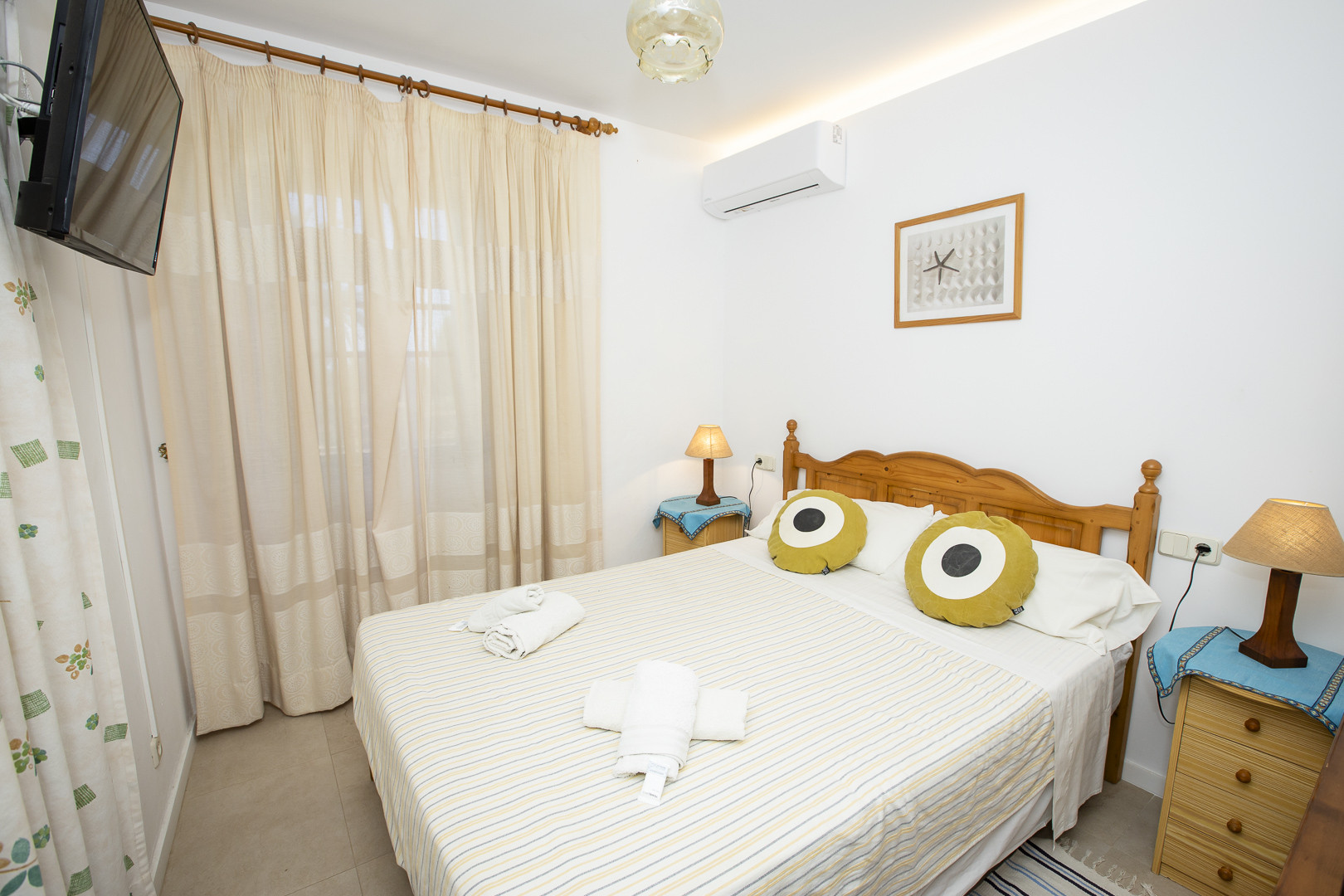 The villa is distributed across 3 bedrooms, designed to ensure maximum rest. The main bedroom features a double bed and television, while the other two bedrooms offer two single beds each. All bedrooms are equipped with air conditioning. The property has two full bathrooms: one with a bathtub and another with a shower tray, both equipped with a hairdryer for added comfort.