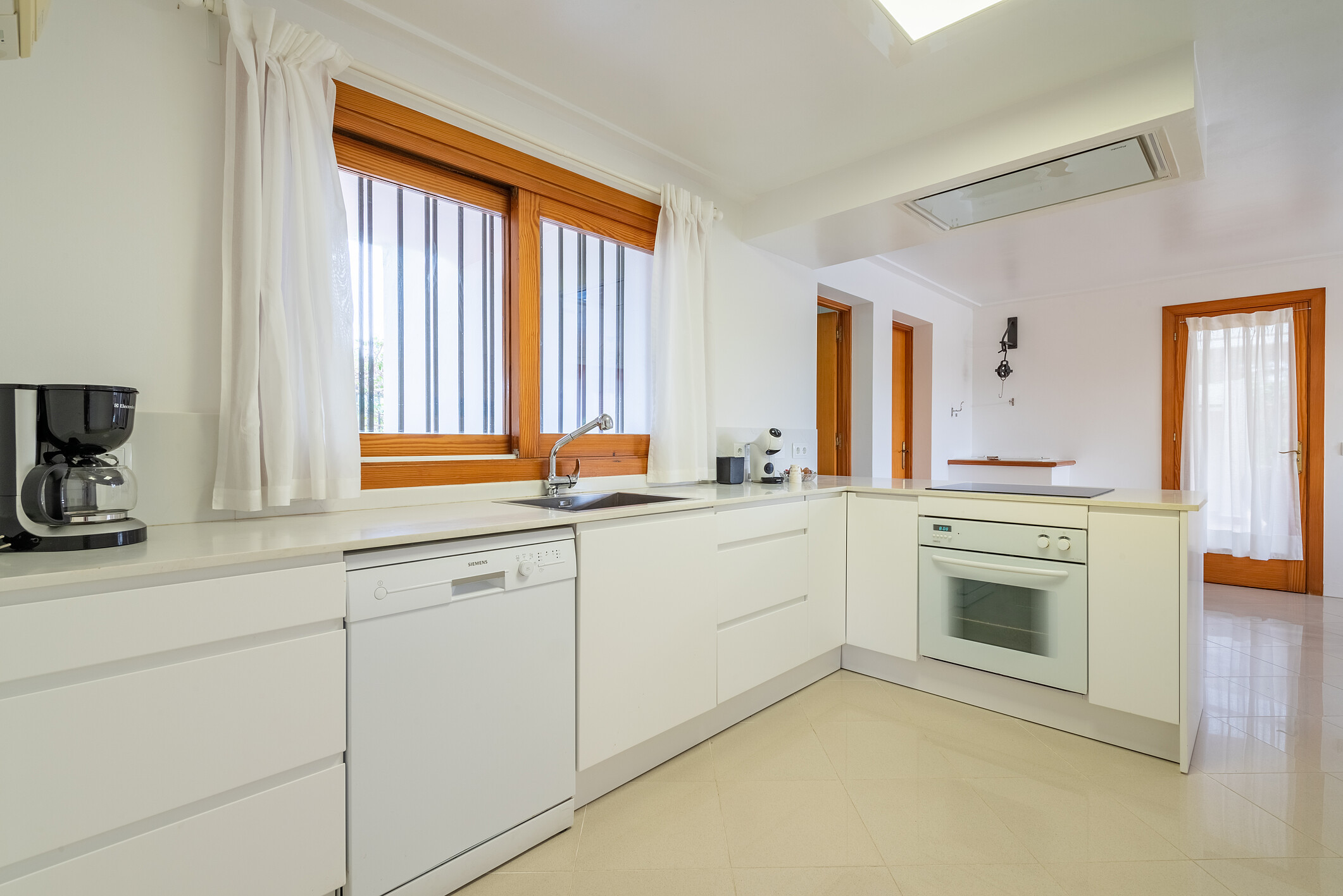 The property is a two-storey house. We enter via the hallway which has an attractive staircase with carved wooden banister leading to the upper floor. Entering the dining-living area we can relax on the sofa or have a seat at the breakfast bar to enjoy the wonderful views. The dining area has a large table and in the living area there is a 42 inch TV. Adjacent to a bar in the dining room where you can prepare cocktails is the spacious kitchen which is fully equipped with electric cooker, oven, fridge, freezer, microwave, coffee machine, dishwasher, toaster and kettle as well as all the kitchenware you will need. Finally on the ground floor there is one bedroom with double bed including en suite with bath. From this bedroom there is direct access to the main terrace. On the first floor there are a further three double bedrooms, one with a double bed and the others with twin beds. These three bedrooms have access to a large terrace and enjoy spectacular views of the sea. There are two bathrooms on this floor, one of these with whirlpool bath and the other with a shower.