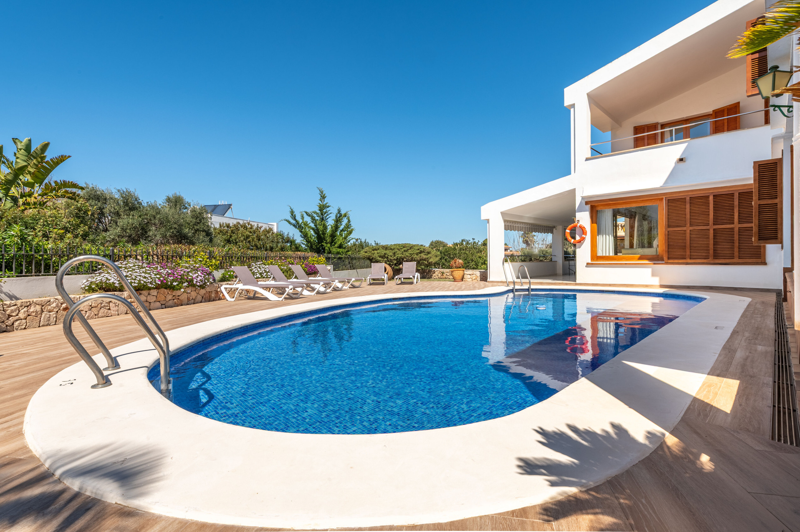 Two-floor villa for 8 people in Portocolom, with 4 bedrooms, 3 bathrooms and an elevated pool.