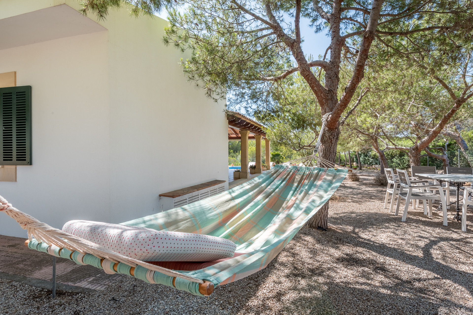 The exteriors of the house are very spacious. From the dining room, we access the covered terrace area with an armchair area and a dining table, next to the terrace, there is a pool surrounded by hammocks and pine trees. The back garden of the house is a very nice pine area with tables, hammocks and a barbecue.