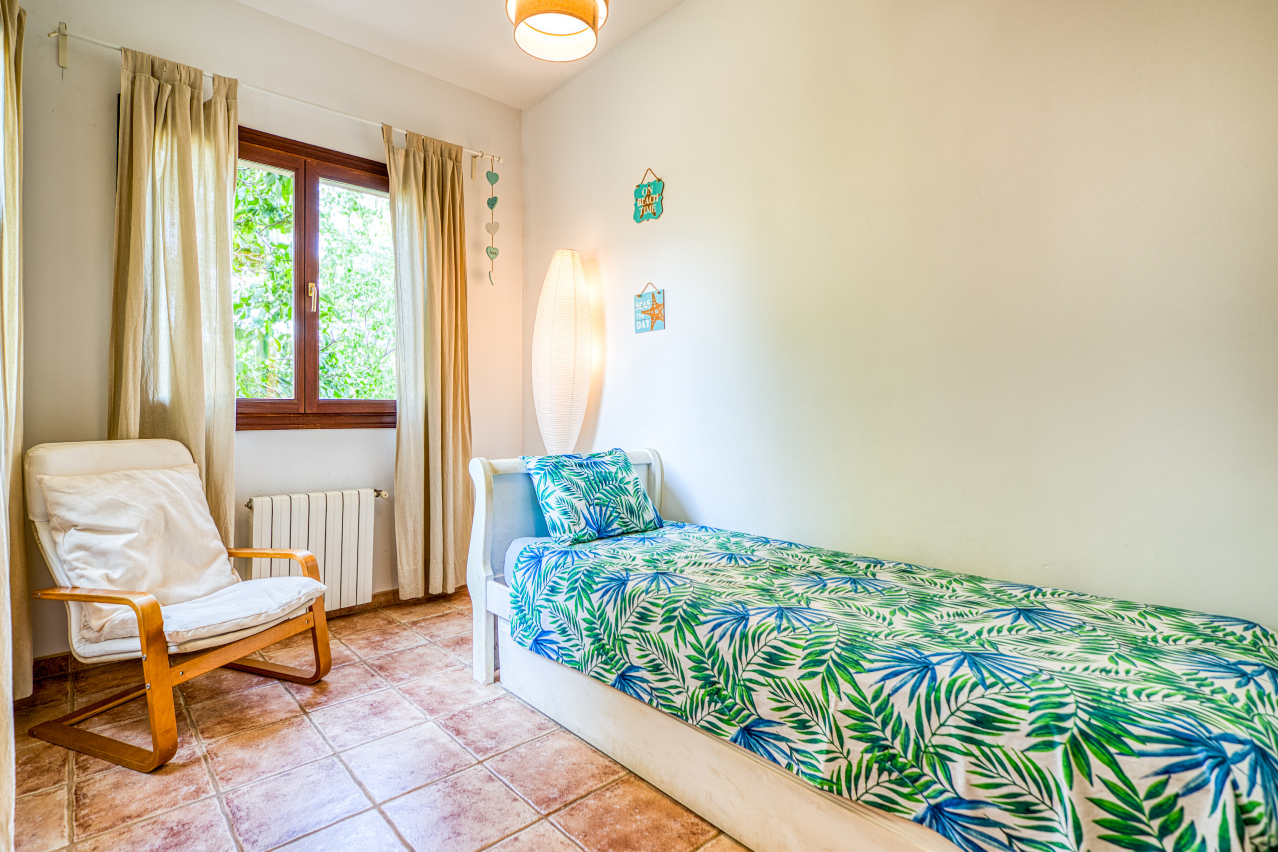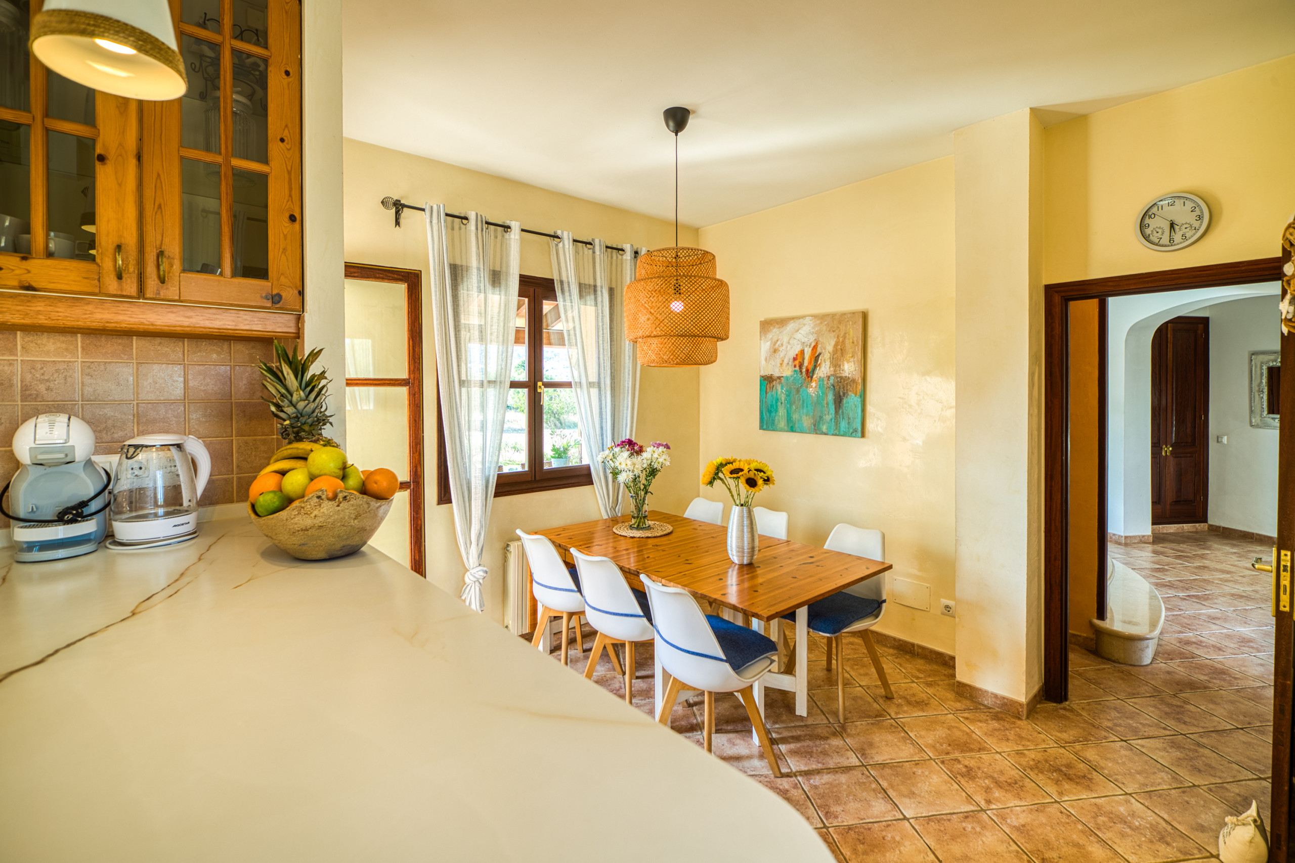 Outside, the expansive, fenced garden offers panoramic mountain views. A superb 8x4-metre pool takes centre stage, surrounded by a sun terrace with loungers where you can soak up the Mallorcan sunshine. The barbecue area, complete with garden furniture and a picnic spot, provides the ideal setting for al fresco meals and memorable get-togethers. Every corner has been thoughtfully designed to balance practicality with the authentic charm of Mallorca.